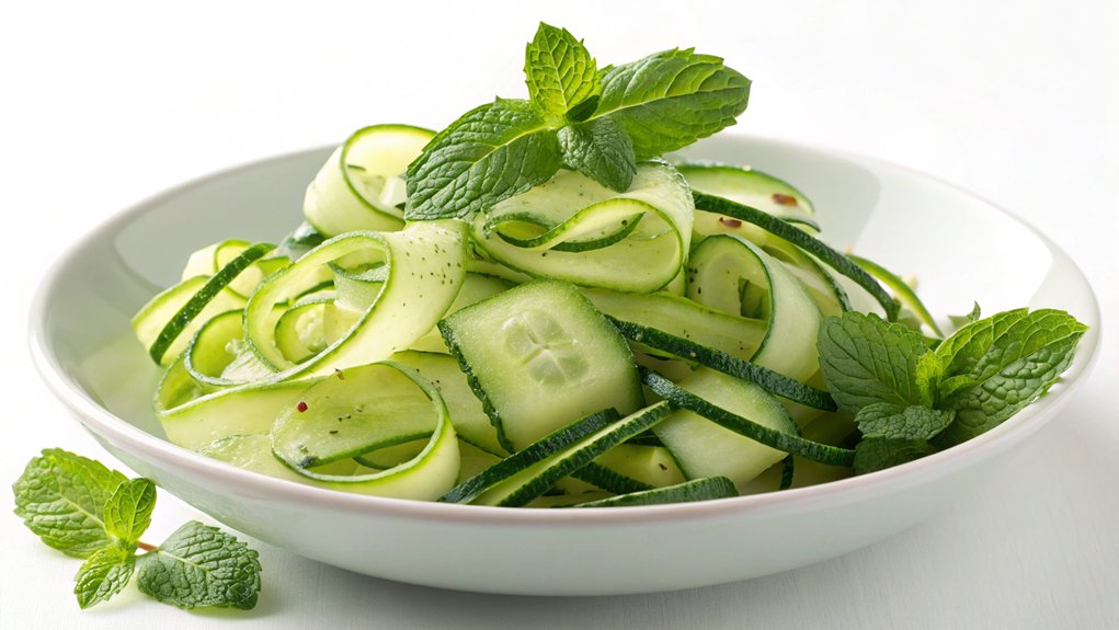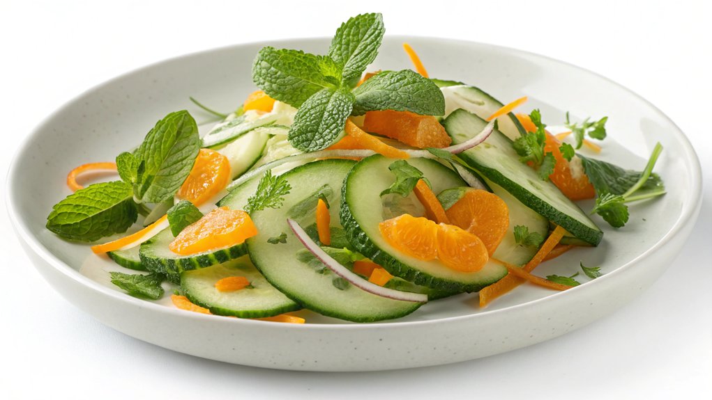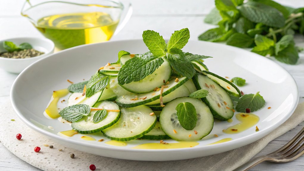 Absolutely, mint elevates cucumber salad with its cooling properties and invigorating taste. This herb balances flavors, enhances cucumber benefits, and complements summer dishes. Try different salad variations for healthy snacks that excite your palate.